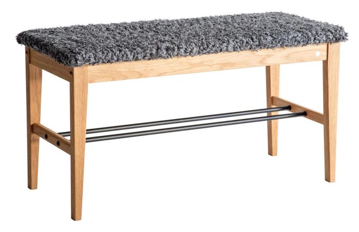 Hallbänken finns i flera ytbehandlingar med valfri färg på äkta fårskinnsdyna eller fårskinnslook. Hyllan under bänken ger möjlighet till skoförvaring.