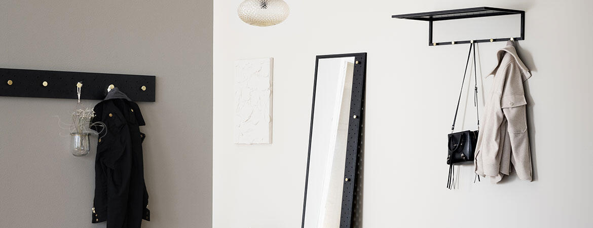 Malone är en praktisk stilsäker hallserie från Rowico i svart metall med perforerad plåt och med en elegant guldfärgad finish. Serien Malone är tillverkad av svart pulverlackad metall med sandstruktur. Flera av delarna har metallknoppar i borstad guldfärg. På klädhängaren och den höga spegeln väljer du själv var du sätter dina knappar tack vare flexibiliteten i den perforerade plåten. Hallserien har en mängd olika smarta delar som lyfter vilken hall som helst. Tänk också på att flera av delarna går alldeles utmärkt att ha i flera andra rum. Som till exempel skapa ett praktiskt nattduksbord av den flexibla och stilrena hyllan. Malone är designad av teamet på Rowico Home.