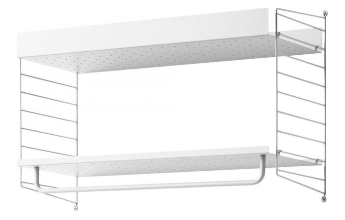 Stilren hatthylla från String med deras klassiska väggavlar och hyllplan av metall, för att förvara torra som blöta mössor, hattar och handskar. Häng ditt paraply eller varför inte ett par String galgar på metallstången. Paketet innehåller två väggavlar 50x30 och ett metallhyllplan med hög kant och ett med låg kant, samt en metallstång 78 cm. Totalbredd 80 cm, djup 30 cm och totalhöjd 50 cm.
