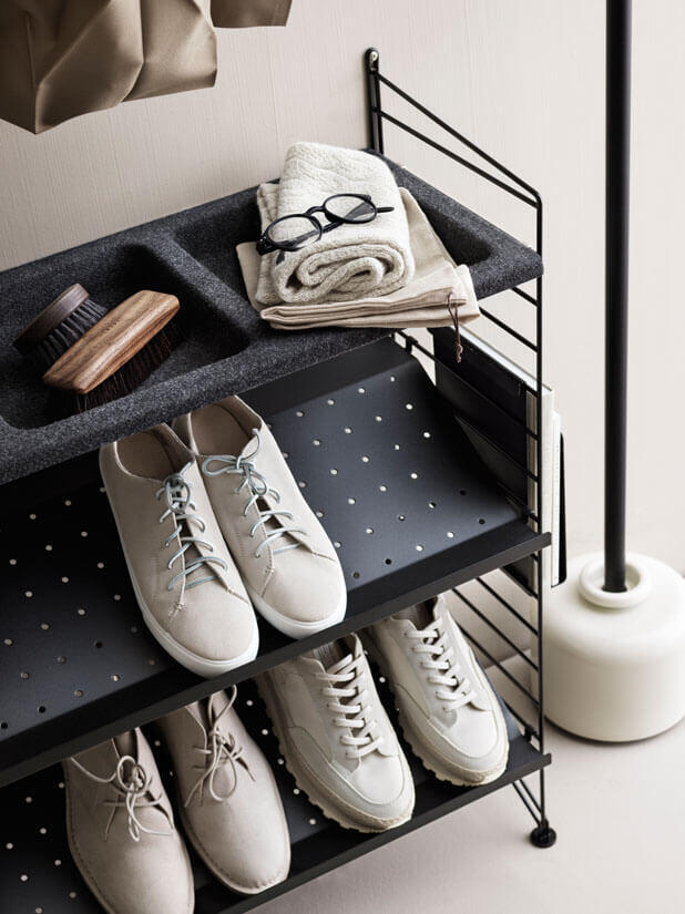 Vägghängd skohylla med generös plats för dina skor. Hyllplanen och väggavlarna är tillverkade av metall vilket gör dem enkla att torka av och hålla rena även på regniga dagar. Det här paketet innehåller två väggavlar 50x30 cm och två skohyllor i metall 78x30 cm. Totalbredd 80 cm, djup 30 cm och totalhöjd 50 cm.
