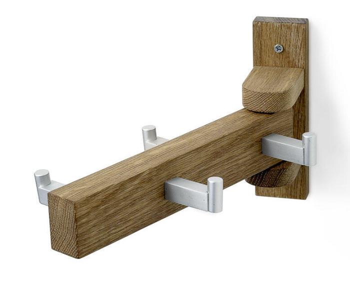 Zitti krokhållare med en svängbar arm som håller 4 aluminiumkrokar för smidig förvaring. Finns i oljad och svartlackerad massiv ek eller vitlackad MDF.