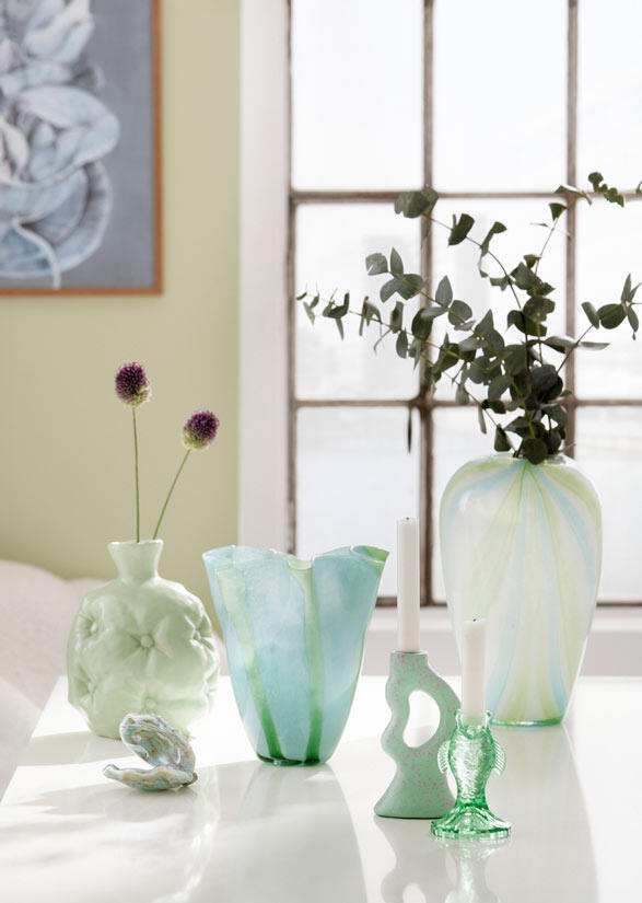 Utforska skönheten i Wide Stripes glasvas i grönt och turkost. Med sina breda ränder i gröna och turkosa toner tillför denna eleganta vas en modern touch till ditt hem. Tillverkad av högkvalitativt glas är den både robust och lätt att rengöra. Perfekt för alla typer av blommor, den här vasen ger en sofistikerad känsla till din inredning och skapar en levande atmosfär. Ett konstverk som kommer att bli ett iögonfallande tillskott till ditt hem!