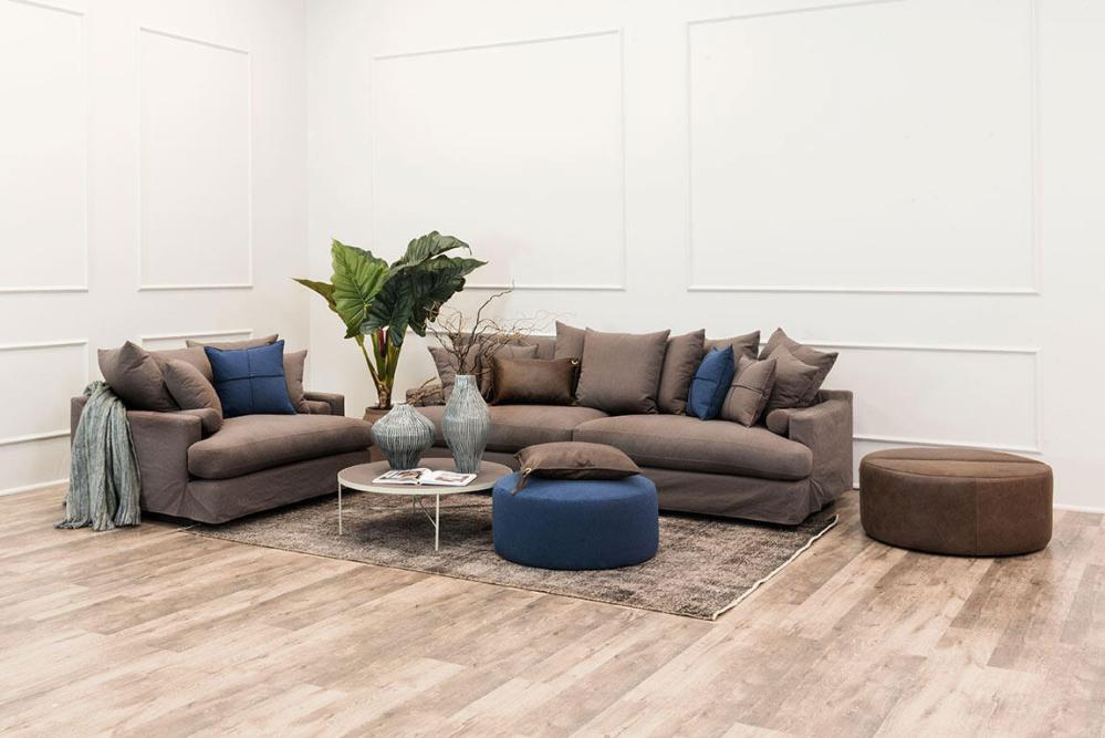 Produktskissen visar 2,5-sitssoffan som har 5st stora kuddar, 2st prydnadskuddar och 2st rullkuddar. Hela möbelns klädsel är avtagbar och tvättbar, inklusive stomme. Tvättinstruktioner enligt tvättråd på tyg.
