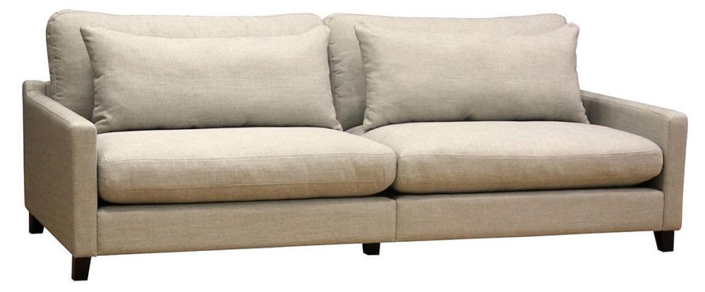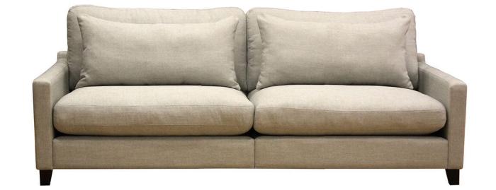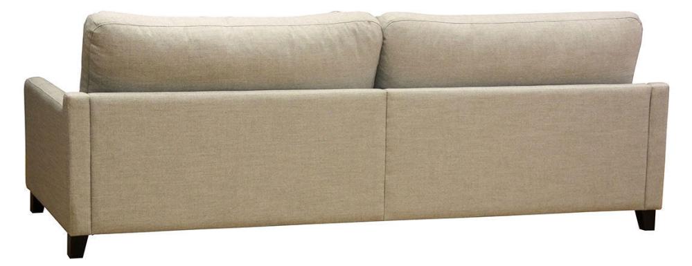 Den här 2,5-sitssoffan med fast klädsel är 201 cm bred. Modellen levereras nästintill helt redo att användas, det enda du behöver göra innan du kan slå dig ner är att skruva på de fyra träbenen.