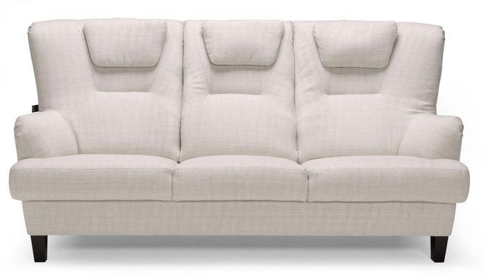 Soffan Greta finns i två storlekar, 2-sits 140 cm och 3-sits 196 cm. Välj bland flera tyg- och läderklädslar och träben 12 cm eller metallben 10,5 cm.