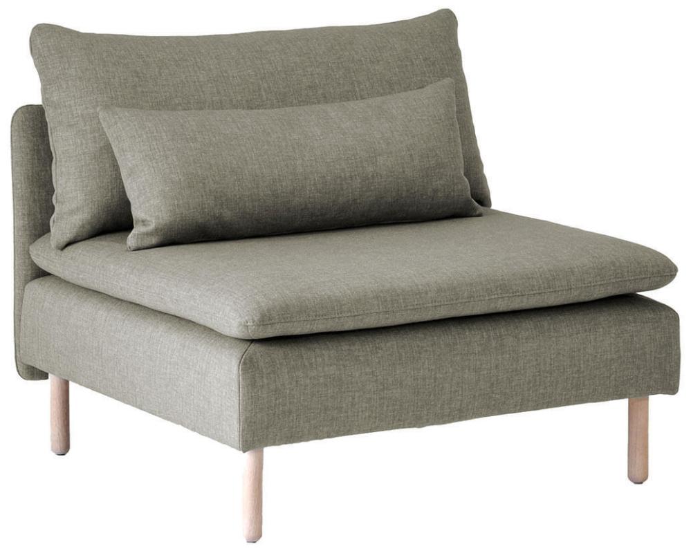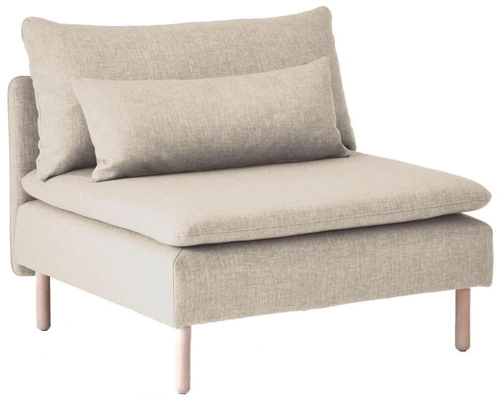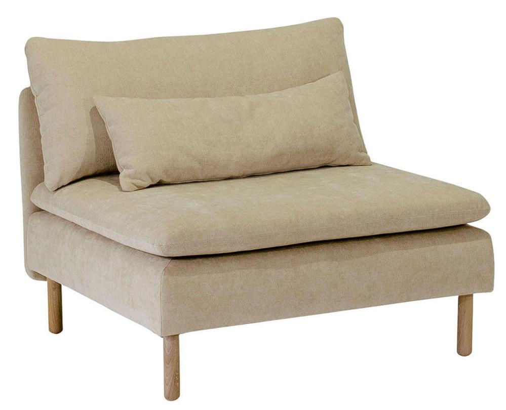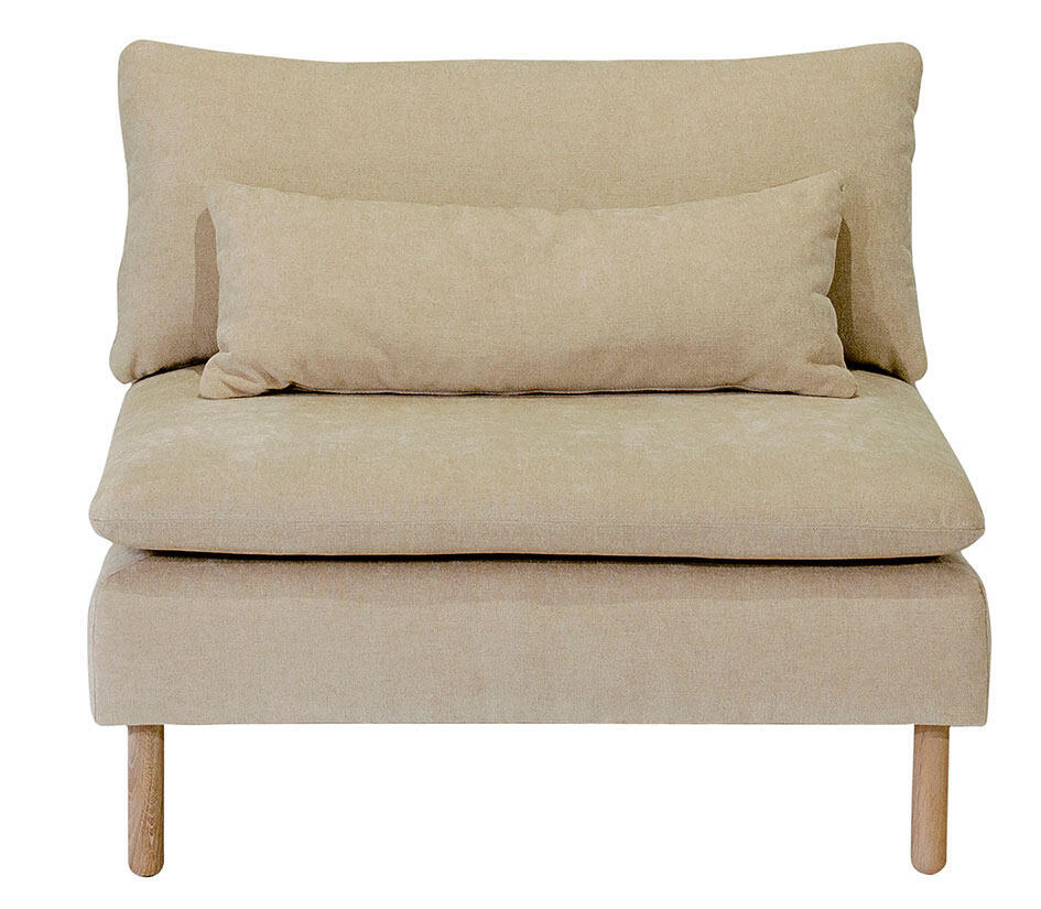 Den här artikeln består av en 1-sits utan armstöd, inklusive dynor, valfria ben och tyg. På frilagd produktbild visas tyg Elba Natural med vitoljade ekben.
