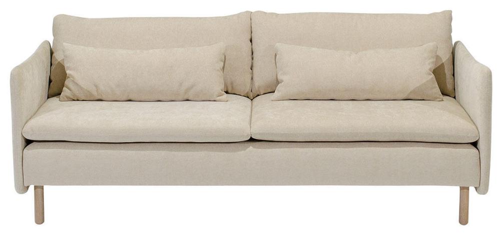 Den här färdigkomponerade artikeln består av en 3-sits med delad dyna och armstöd på vardera sida, tillsammans skapar de en 3-sitssoffa. Inklusive dynor, valfria ben och tyg. På frilagd produktbild visas tyg Elba Natural med vitoljade ekben.