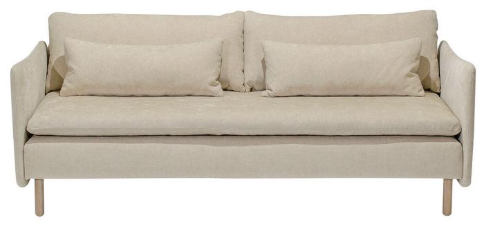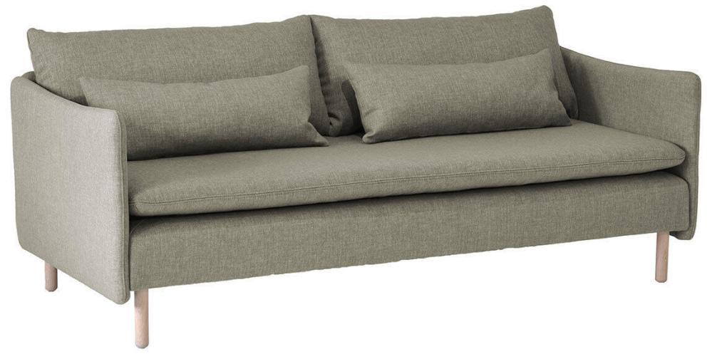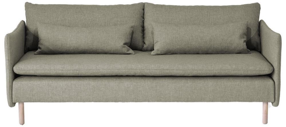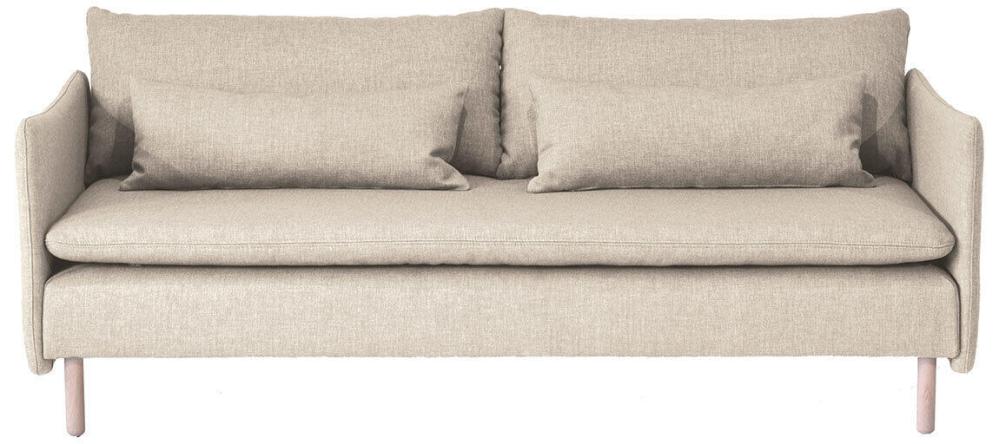 Den här färdigkomponerade artikeln består av en 3-sits med hel dyna och armstöd på vardera sida, tillsammans skapar de en 3-sitssoffa. Inklusive dynor, valfria ben och tyg. På frilagd produktbild visas tyg Elba Natural med vitoljade ekben.
