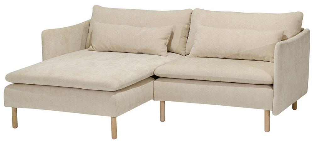 Den här färdigkomponerade artikeln består av en 1-sits med ett armstöd + divan med ett armstöd, tillsammans skapar de en divansoffa. Inklusive dynor, valfria ben och tyg. På frilagd produktbild visas tyg Elba Natural med vitoljade ekben.