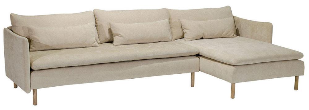 Den här färdigkomponerade artikeln består av en 3-sits med hel dyna och ett armstöd + divan med ett armstöd, tillsammans skapar de en divansoffa. Inklusive dynor, valfria ben och tyg. På frilagd produktbild visas tyg Elba Natural med vitoljade ekben.