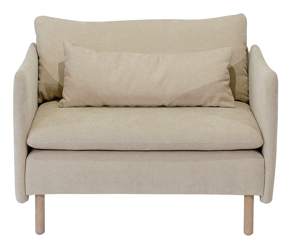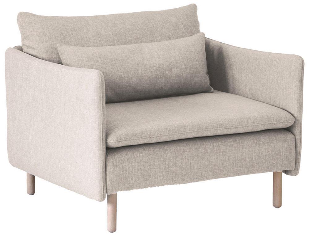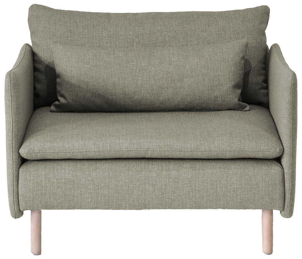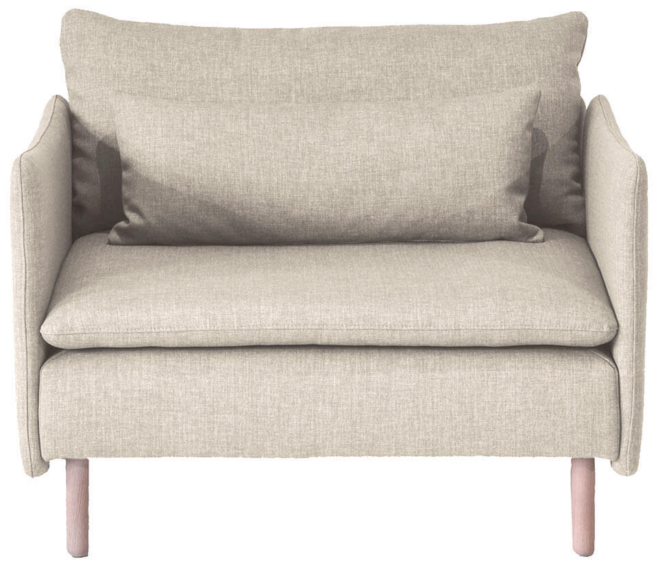 Den här färdigkomponerade artikeln består av en 1-sits med armstöd på vardera sida, tillsammans skapar de en fåtölj. Inklusive dynor, valfria ben och tyg. På frilagd produktbild visas tyg Elba Natural med vitoljade ekben.