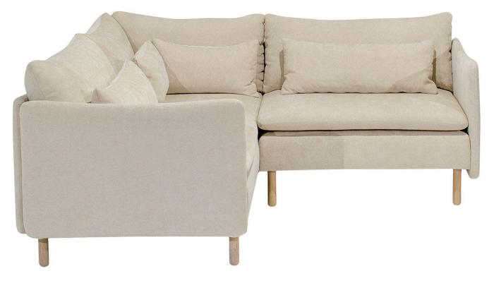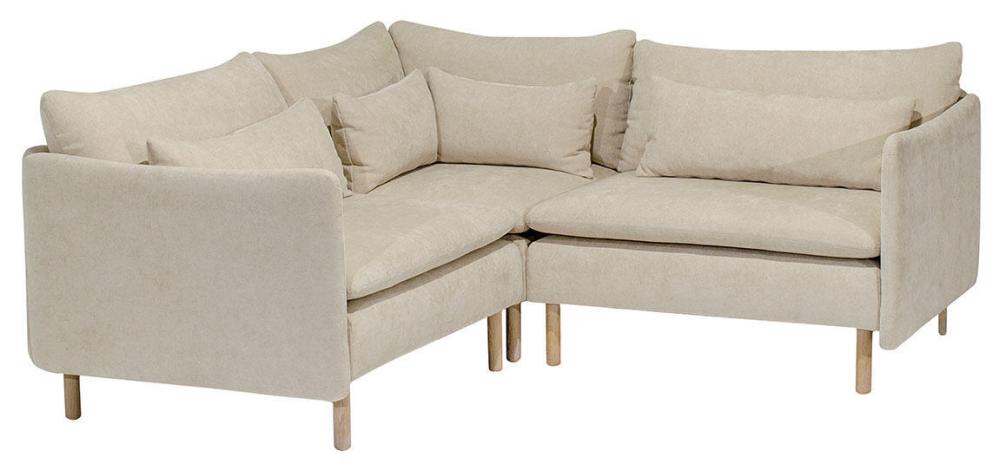 Den här färdigkomponerade artikeln består av en 1-sits med ett armstöd + hörn + 1-sits med ett armstöd, tillsammans skapar de en hörnsoffa. Inklusive dynor, valfria ben och tyg. På frilagd produktbild visas tyg Elba Natural med vitoljade ekben.