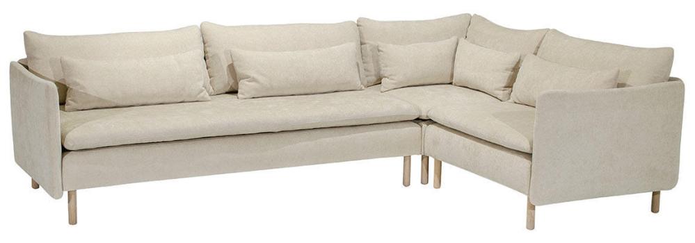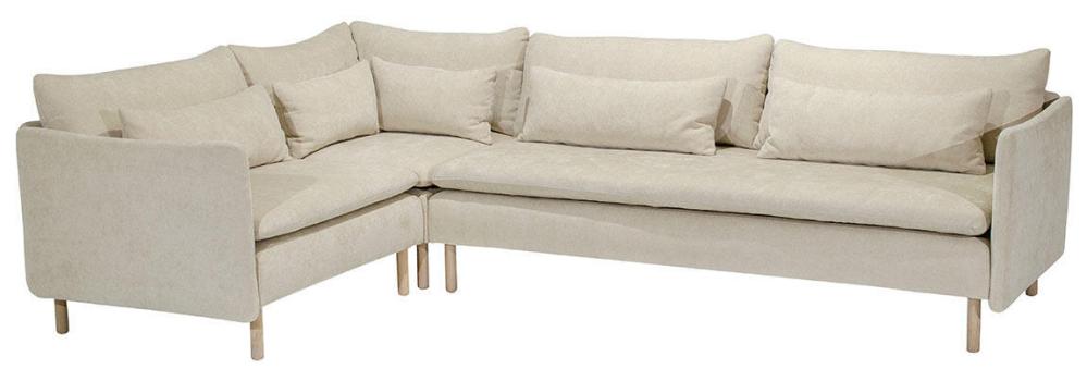 Den här färdigkomponerade artikeln består av en 3-sits med hel dyna och ett armstöd + hörn + 1-sits med ett armstöd, tillsammans skapar de en hörnsoffa. Inklusive dynor, valfria ben och tyg. På frilagd produktbild visas tyg Elba Natural med vitoljade ekben.