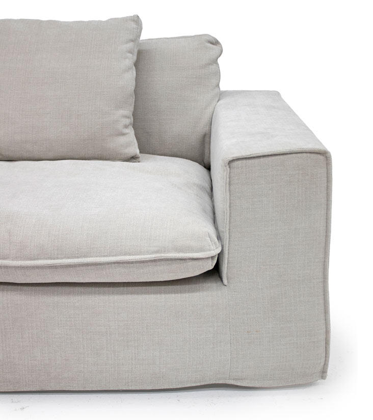 Den stora sittdynan i ett enda stycke ger en sammanhållen och följsam yta som uppmuntrar till att krypa upp tillsammans, medan de mjuka rygg- och armstöden ger ett omfamnande stöd.