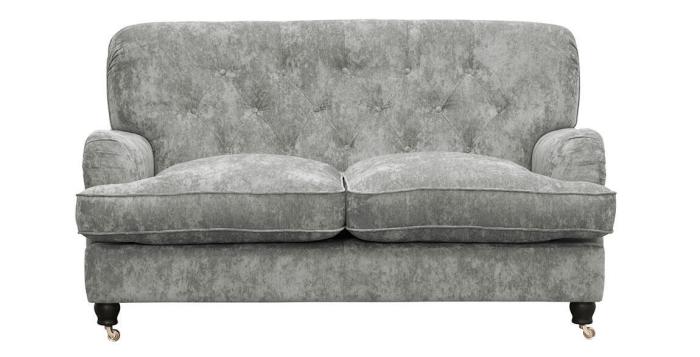 Soffan Lysekil finns i två storlekar, 2-sits och 3-sits samt i rakt eller svängt utförande. Den här artikeln visar den raka modellen i storlek 2-sits som är 160 cm bred. På produktbilden visas tyget Tempo Elephant med svarta träben och hjul i krom. 2-sitssoffan levereras med hel stomme, det enda som behöver göras är att skruva på benen.