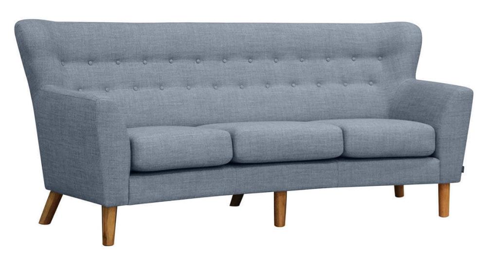 Monza 3-sitssoffa i svängt utförande från Burhéns, är en soffa som väcker tankar till den klassiska stilen, inte minst på grund av möbelns formspråk och de dekorativa knapparna i ryggen. Monza finns även i andra soffstorlekar, fåtölj och fotpall.