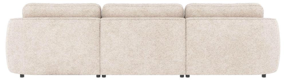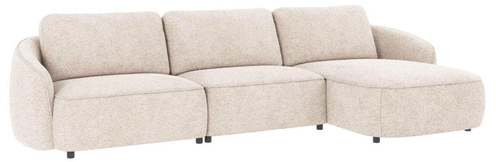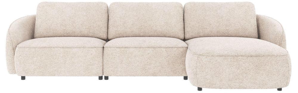 Norris 4-sitssoffa med divan höger, här klädd i tyget Anna ljusbeige (#2) i en jordnära ton, är en soffa med runda, organiska former som skapar en harmonisk känsla i hemmet. Ryggkuddarna är lösa och skapar extra komfort, de går att placera tätt ihop eller med ett litet mellanrum. Sittdynan är fast och innehåller nozag-fjädrar för att skapa en skön sittyta.