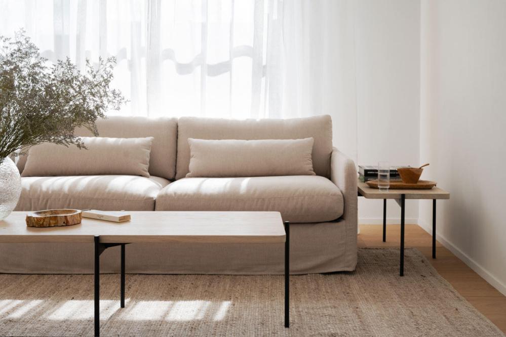 Soffan Peyton i elegant ljusbeige linne-liknande tyg ger en tidlös och komfortabel känsla till ditt vardagsrum. Denna soffa kombinerar modern design med ett härligt tyg som håller över tid.