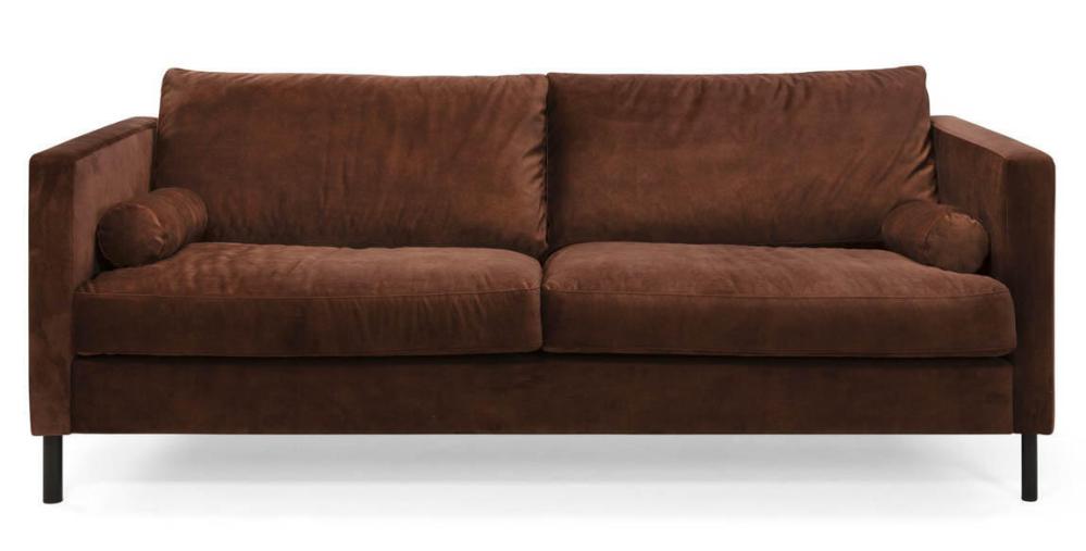 Denna modell: Arm (I) + 3-sits med 2 plymåer (G) + Arm (I). På produktbilderna visas tyg Adore Medium Brown 14 med svarta metallben. Två rullkuddar (pölar) ingår i priset. Observera att soffan på bild har dunstoppning i sits, standardstoppning i kallskum gör så att dynorna blir något rakare i formen.