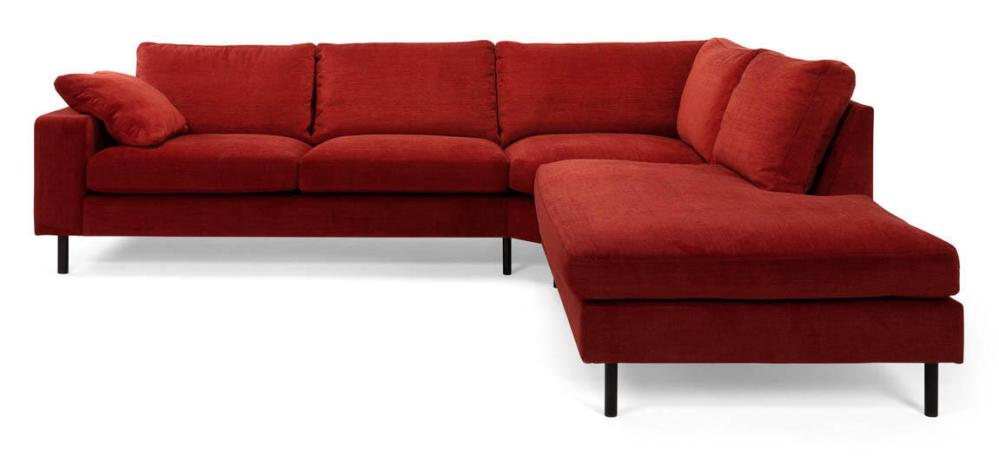 Denna modell: Arm (E8) + 2,5-sits (F) + 90 grader hörn (D2) + Relaxdel avslut (F1) i tyg Club Rust 22 med svarta metallben. En armstödskudde i soffans tyg ingår i priset. Exkl. nackkudde. Observera att soffan på bild har dunstoppning i sits, standardstoppning i kallskum gör så att dynorna blir något rakare i formen.