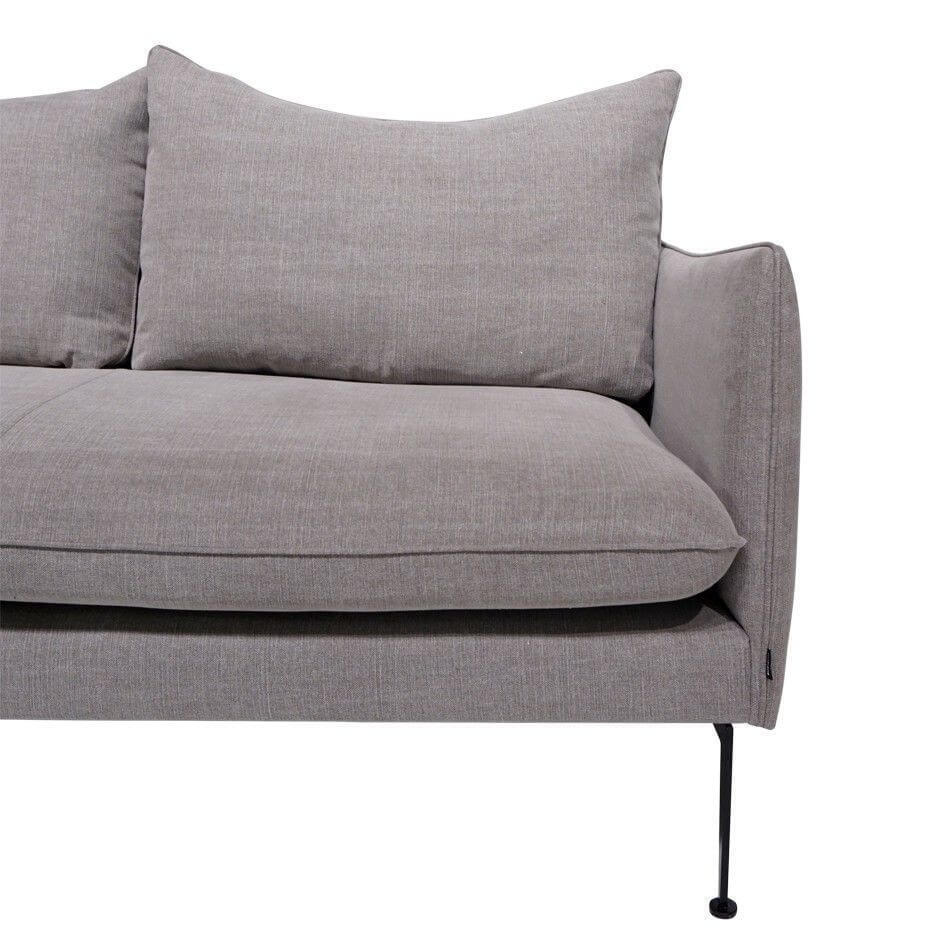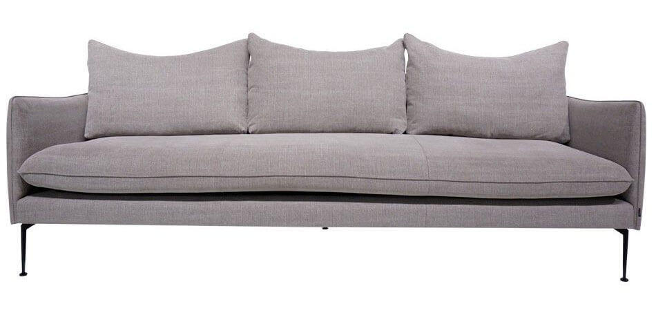 Vision är en supersnygg, modern soffa med en enda lång sittplymå av 50kgs kallskum. De tre lösa ryggdynorna är vändbara och är stoppade med fiber och fjäder så att soffan blir riktigt bekväm att sitta i. Visas här i tyg Kiss i färgen Stone.
