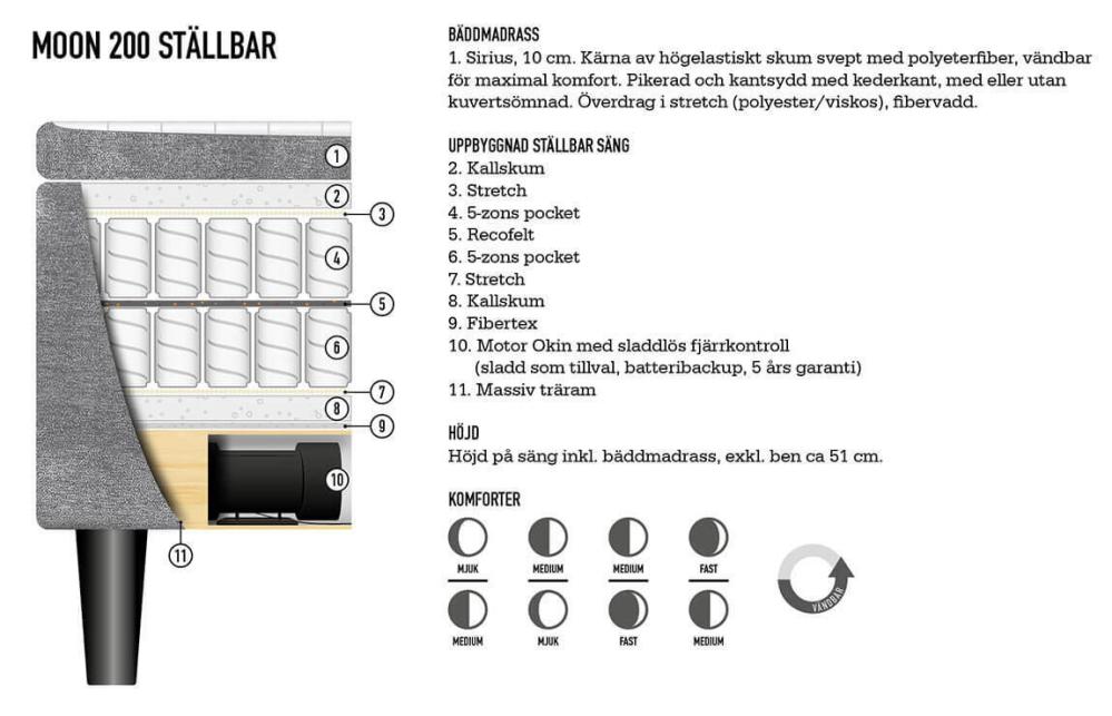 Moon 200 är sovplatsen för livets alla lägen! Uppskattad design i kombination med bästa teknik. En säng som uppfyller samtliga behov av ställbarhet och komfort med den trådlösa eller trådbundna fjärrkontrollen justeras sängen enkelt efter de behov som finns. Den ställbara sängen har en 5-zonad dubbelfjädrande pocket som ger hög komfort och tack vare att kassetten är vändbar kan du anpassa sängen för optimal komfort. Moon 200 har en tystgående Okin motor med batteribackup, 5 års garanti och en stabil ram av massiv furu.