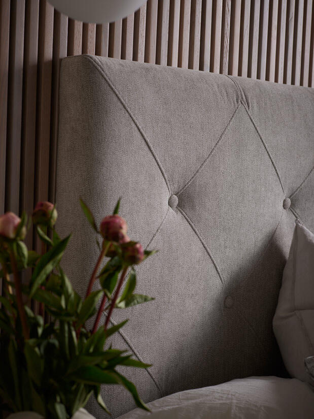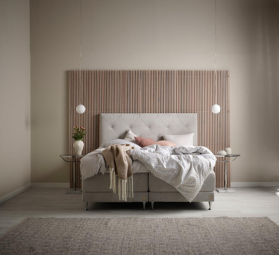 Välj på ett brett urval av färger och tyger. Rakt eller vinklat träben ingår, metallben i krom eller svart finns som tillval. Observera att ben och bäddmadrass tillkommer på sängens höjd som är 41 cm. Köp till en praktisk sängficka.