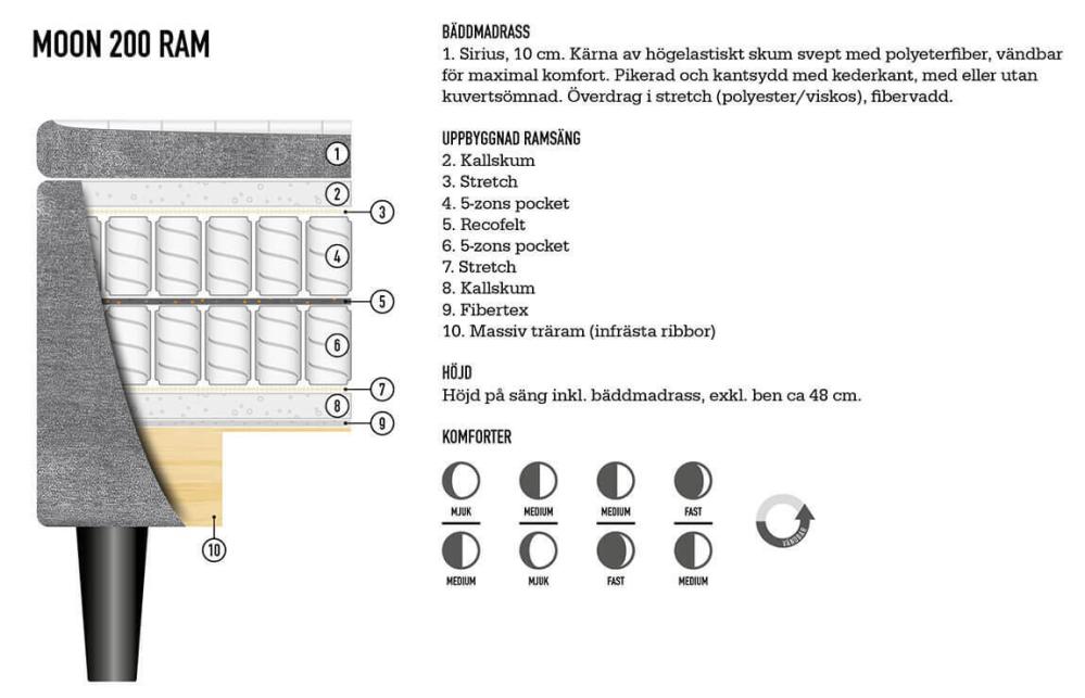 Ramsäng Moon 200 har en 5-zonad dubbelpocket som är vändbar med två komforter för att ge dig flexibilitet och välja den hårdhet som passar dig och din kropp allra bäst, även allt eftersom behoven kan förändras med tiden. Resårsängen finns i ett stort urval av storlekar med en stabil ram av massiv furu och infrästa träribbor som ger en rejäl säng som kommer att hålla många år framöver.