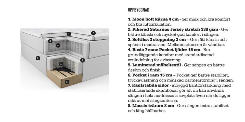 Med Moon 201 får du stabilitet, hållbarhet och komfort. De uppdelade pocketzonerna ger goda ergonomiska egenskaper och bra tryckavlastning för alla kroppstyper. De ger även minskad störning från partner i sängen. Kontinentalsängen har kantförstärkta sidor som ger stabilitet, och laminerad textil vilket ger en förstklassig finish och lång hållbarhet.