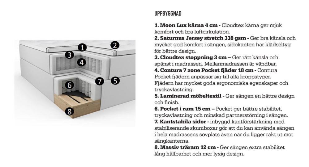 Med Moon 301 får du utmärkt tryckavlastning, stabilitet och komfort. De uppdelade pocketzonerna ger goda ergonomiska egenskaper och bra tryckavlastning för alla kroppstyper. De ger även minskad störning från partner i sängen. Kontinentalsängen har kantförstärkta sidor som ger stabilitet, och laminerad textil vilket ger en förstklassig finish och lång hållbarhet. Extra hållbarhet får du då mellanmadrassen är vändbar.