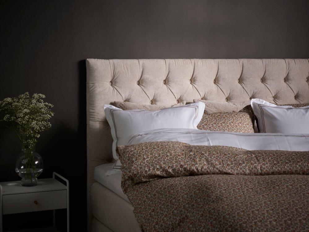 Pallas med sina djuphäftade knappar är en exklusiv sänggavel som pryder vilket sovrum som helst. Den välarbetade gaveln lyfter den inbjudande och ombonade känslan i sängen och gör sovrummet komplett. Huvudgaveln finns i bredder mellan 80-180 cm och kan även måttbeställas med 10 cm intervall för ett tillägg på 10%. Gavelns höjd är 140 och djup 8 cm, bredden bygger cirka 2 cm bredare än sängbredden.