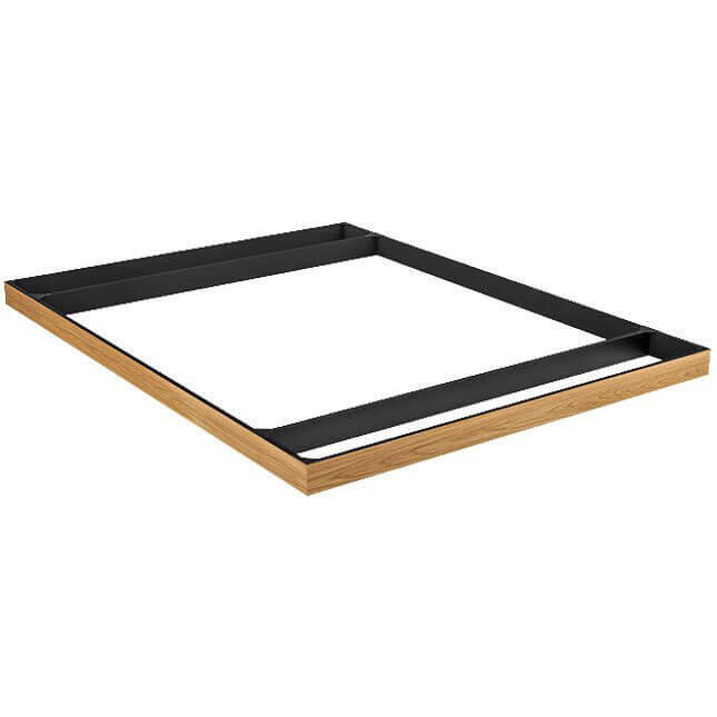 Sockel från Hilding i folierad spånskiva med ekfoliering på ena sidan och svartfoliering på den andra, vilket gör den vändbar.