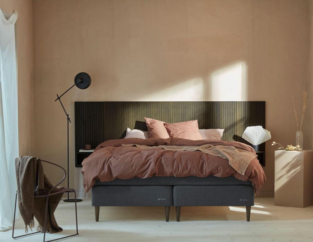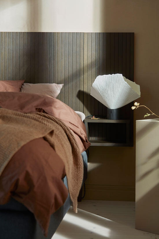 Sidopaneler i trä som gör sig bra på egen hand men extra bra tillsammans med trägaveln i samma design från Hilding. Du hittar gaveln en bit ner på sidan under Liknande produkter, det finns även sängben i samma stil. Den vägghängda träpanelen har ett integrerat sängbord.