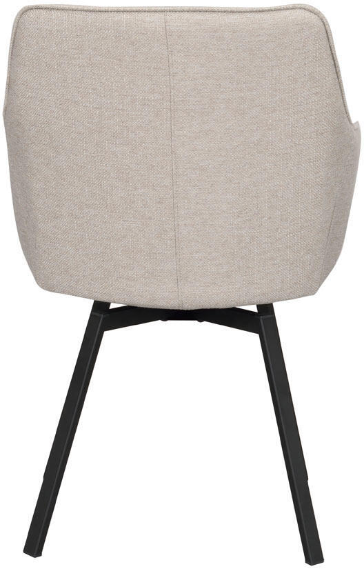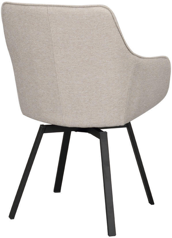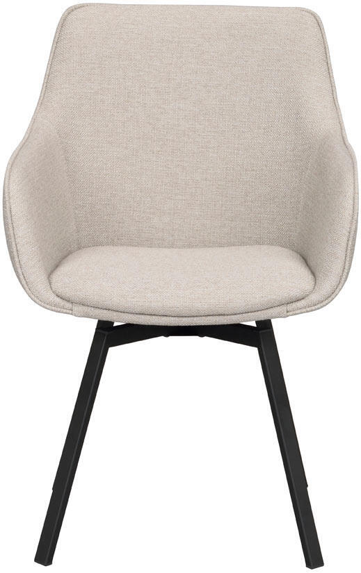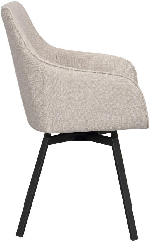 Alison karmstol i beige tyg har precis som populära Alison stol ett snurrbart underrede i 360 grader. Den kupade stoppade sitsen och de höga armstöden gör stolen bekväm och ombonad att sitta i.