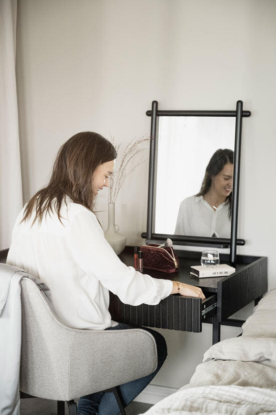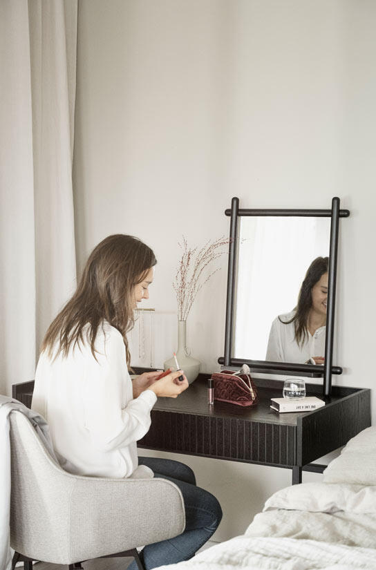 Karmstolen har ett tåligt beige tyg i samma jordnära färg som Alison stol för att kunna matchas tillsammans på ett smakfullt sätt. Träet inuti sitsen består av 100% FSC-certifierat trä och benen består av svart pulverlackad metall.