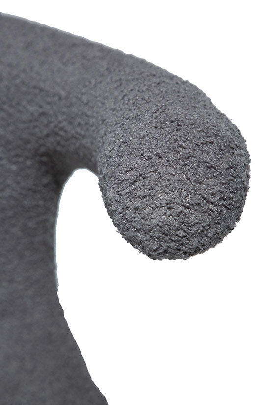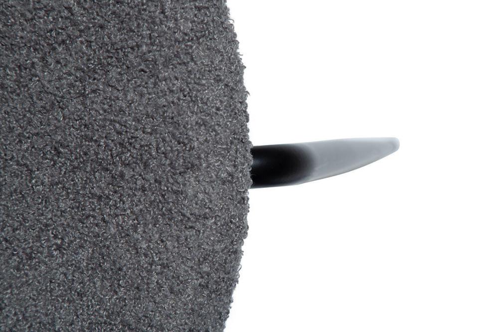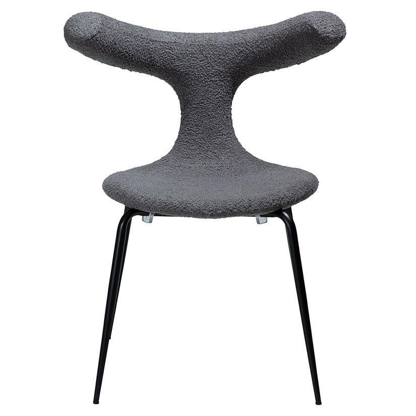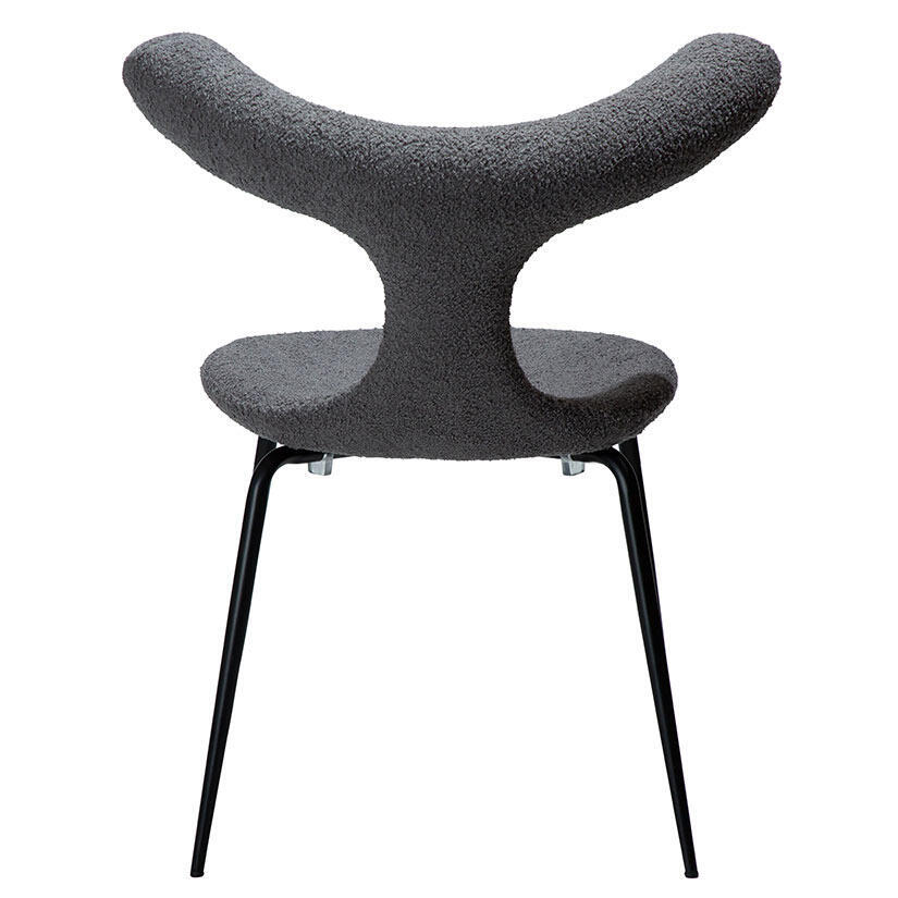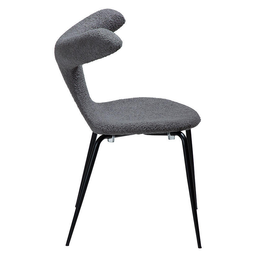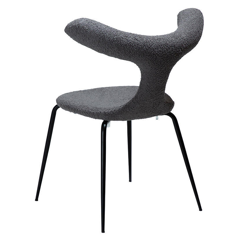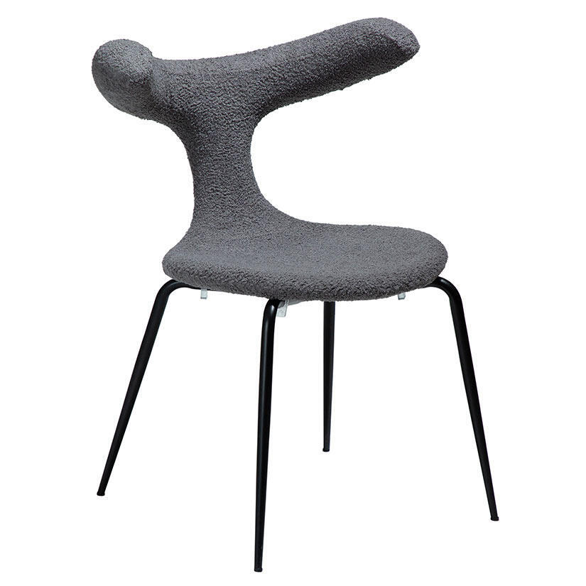 Matstolen kan väljas i två stilrena färgkombinationer i tålig och slitstark återvunnen bouclétyg med matchande underrede i metall.