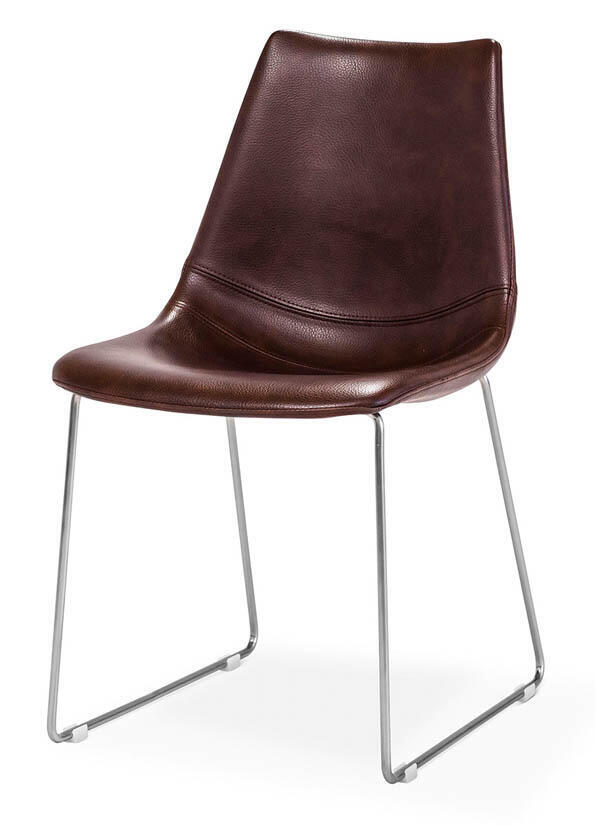Fly är en skön stol i mörkbrunt konstläder med valbart underrede i borstad metall eller svart. Stolen finns även i svart konstläder.