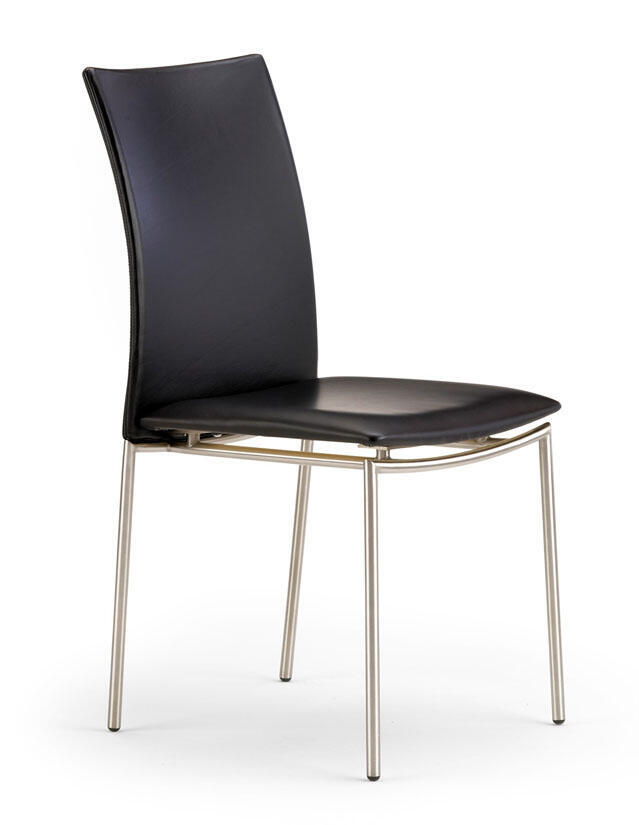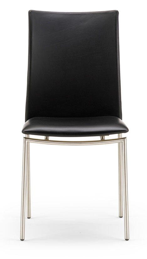 Matsalsstolen Fyn (SM 58) har ett underrede av borstad eller mörkgrå lackat stål med vadderad, dubbelböjd rygg och en bred sits, vilket ger en fantastisk sittkomfort.
