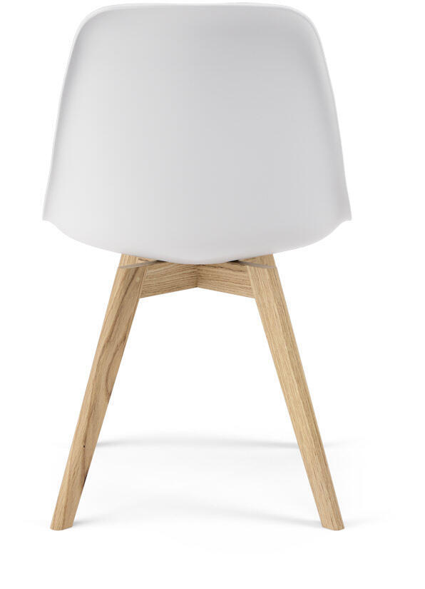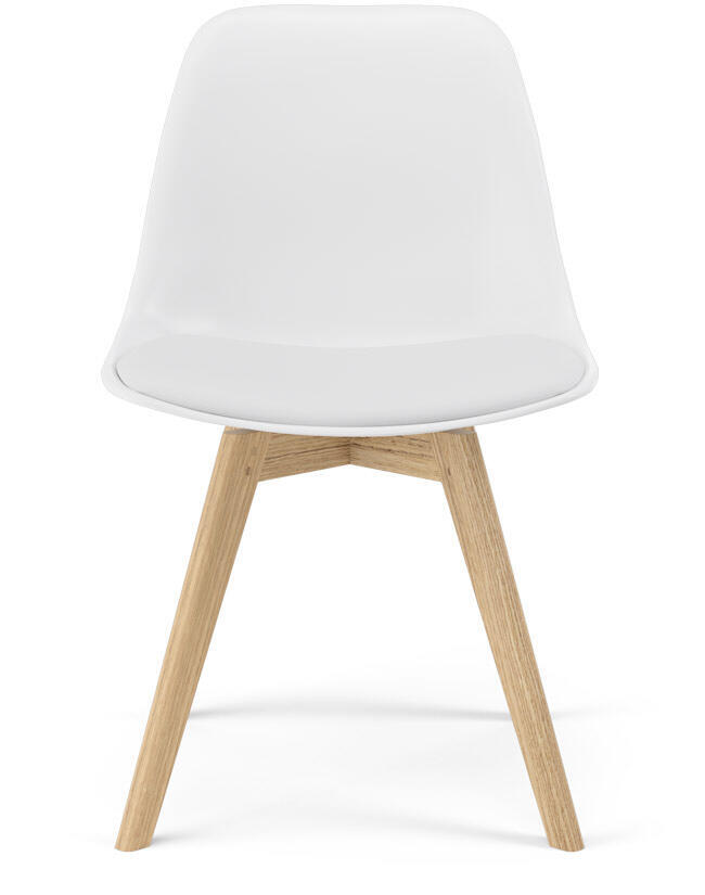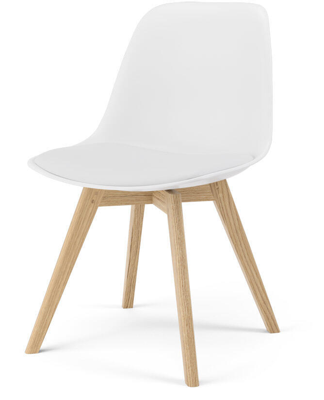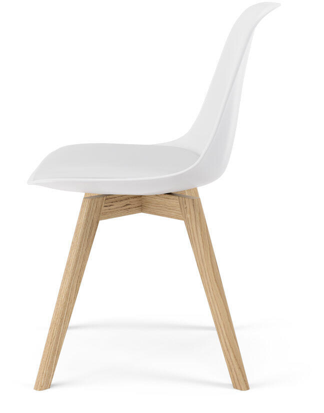 Den här stolen är både en fröjd för ögat som för kroppen. Designen är stabil såväl som komfortabel utan att kompromissa med dess utseende. Stolen har en plastkupa (Gina) i vitt med en matchande sittdyna som vadderats samt blivit klädd i ett vitt konstläder. Till överdelen levereras stolen med det stilrena träunderredet Liz i oljad massiv ek.