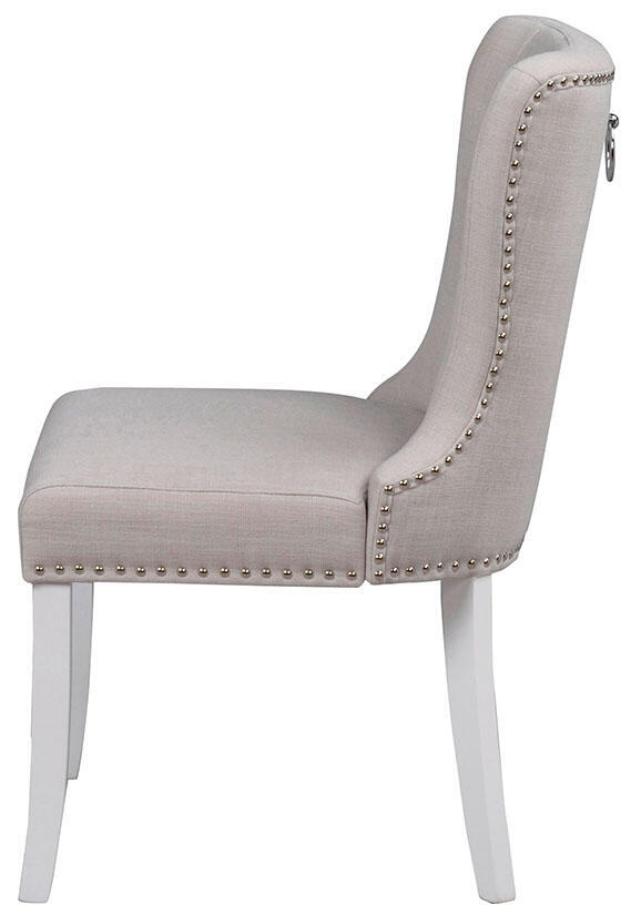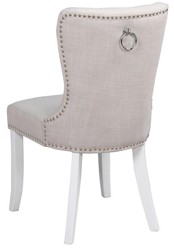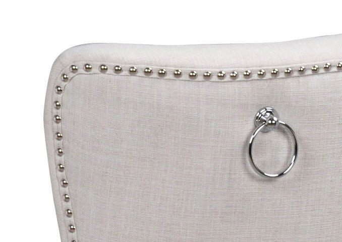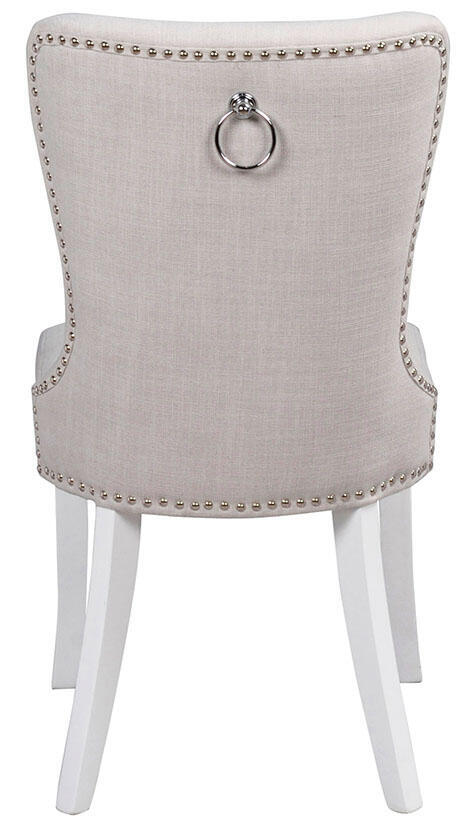 Ina stol är elegant och tidlös med mjuka former. Ben i vitmålat trä. Stolen har en stoppad klädd sits med ett beigt tyg samt nitar i blank metall. På ryggen finns en dekorativ ring som ger det lilla extra. Ina finns i flera färger. Designad av teamet på Rowico.