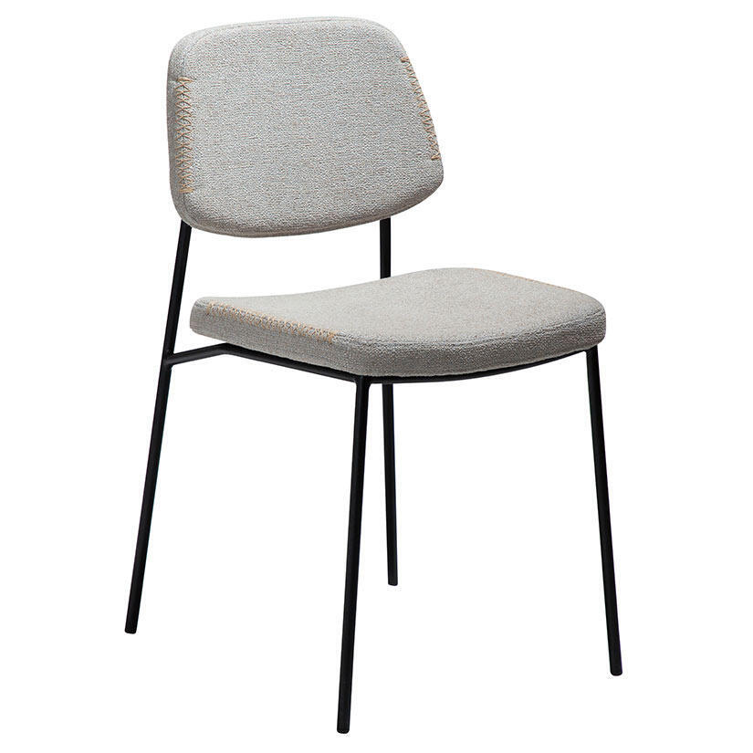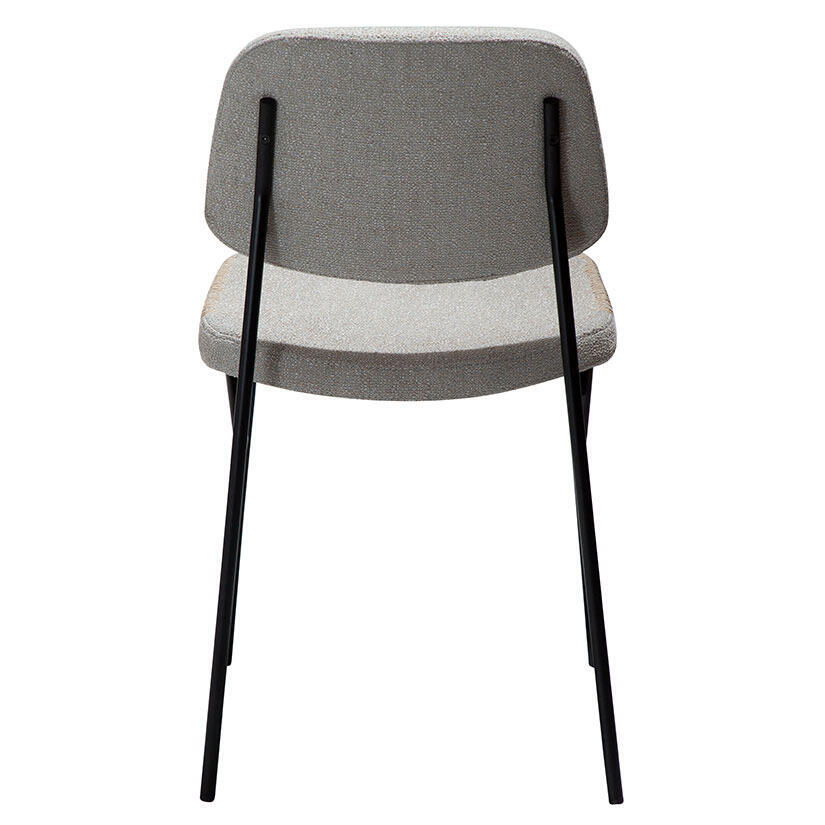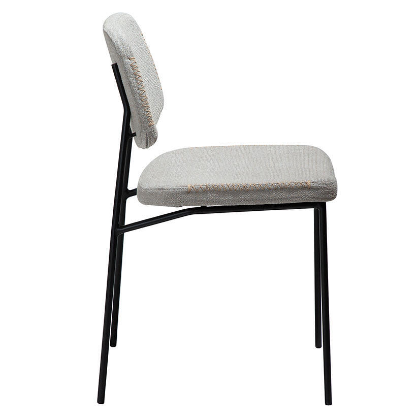 Matstolen Menta kan väljas i två färgkombinationer i bouclétyg med underrede i metall.