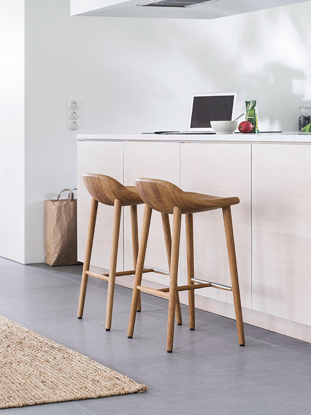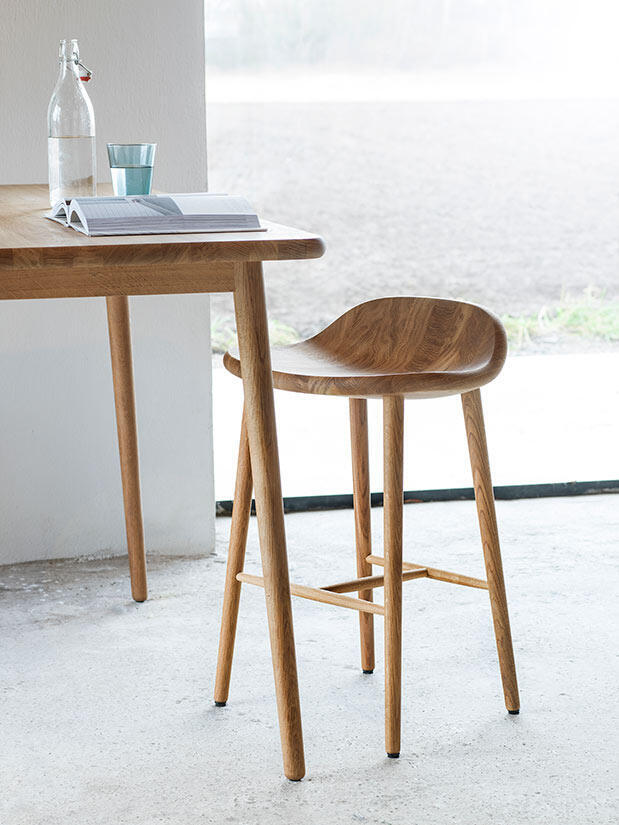 Barstolen är helt i massiv ek som ytbehandlas enligt ditt önskemål och har en sits vars delar först frästs ut, sedan limmats ihop för att slutligen fräsas igen.