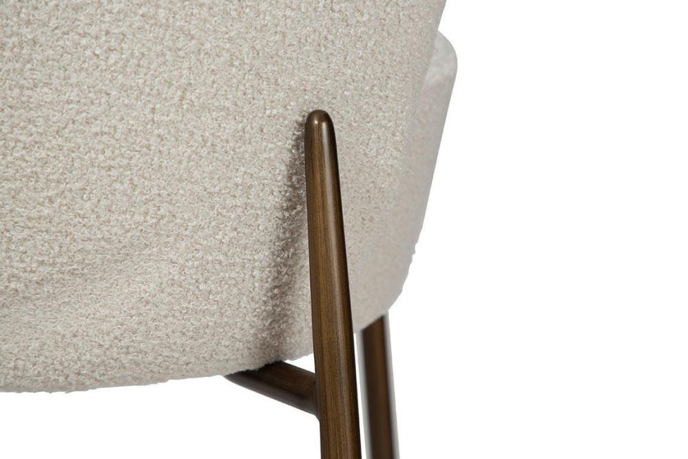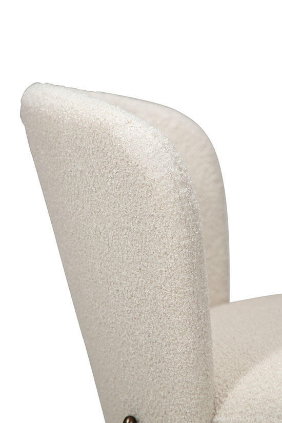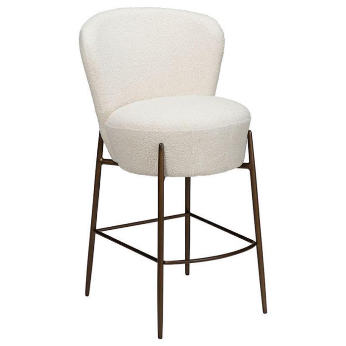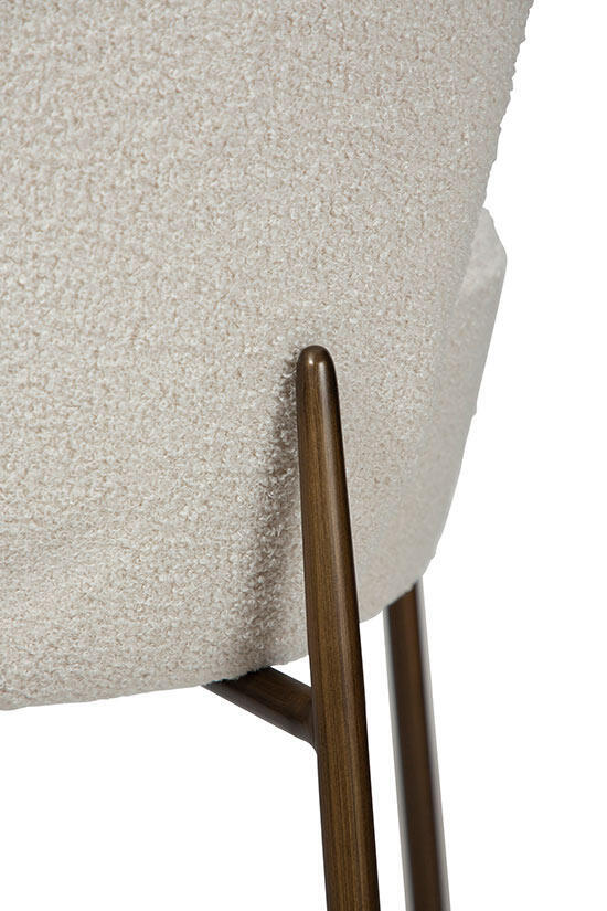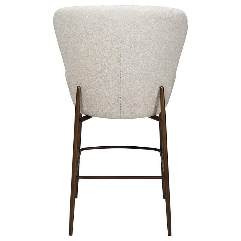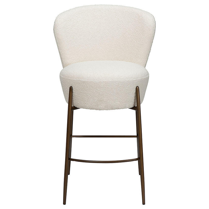Orbit counterstol (låg barstol) i återvunnen bouclétyg har ett distinkt och lyxigt utseende med en rund, mjuk klädd sits och en omslutande rygg. Den eleganta designen accentueras av sina koniska ben, som tillför en touch av sofistikering och lyfter designen. Barstolarna är ett elegant tillskott till vilken bar eller kök som helst.