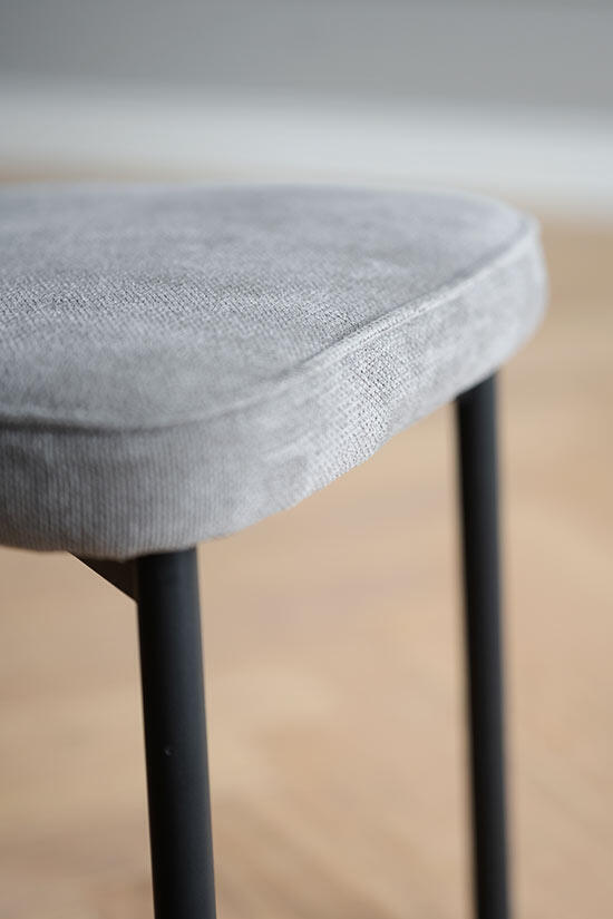 Stomme och ben i pulverlackad metall, i sandstruktur. Sits och rygg i plywood, klädd med polyeterskum, och tyg