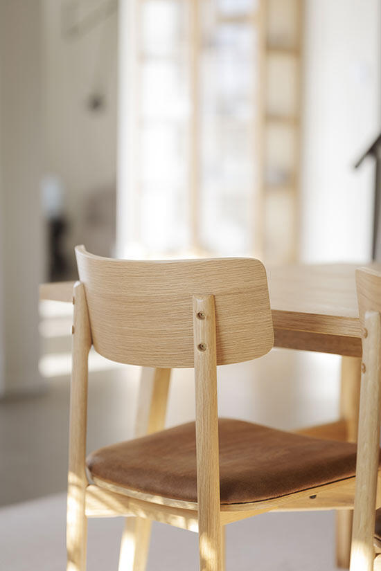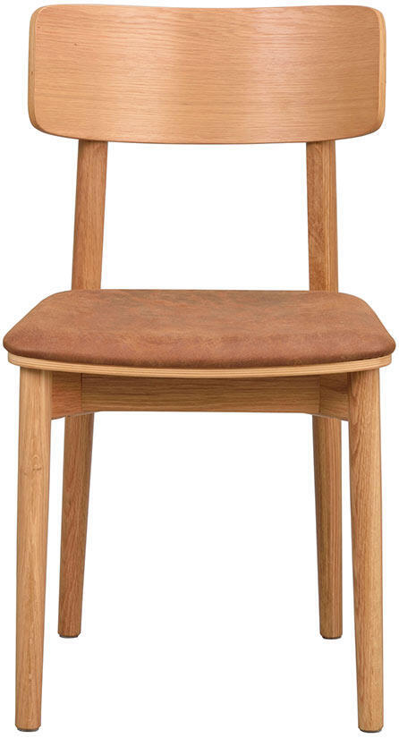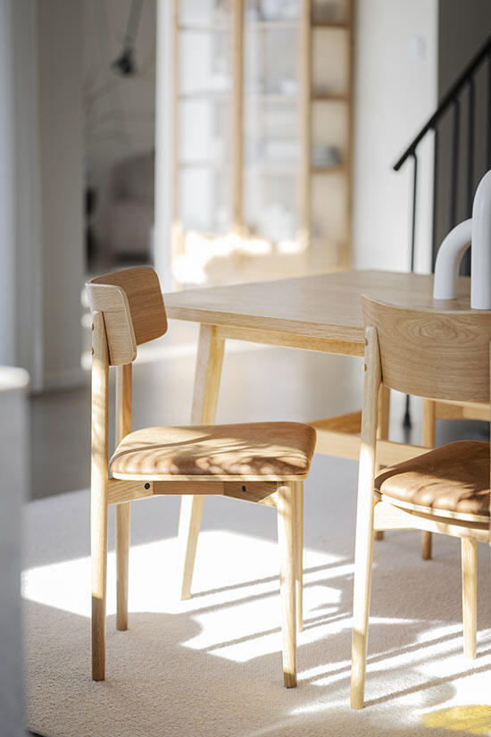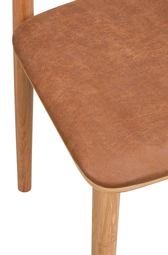 Stolen Wolcott i ek med sits av brun lädertextil har en modern design där raka linjer möter mjuka runda former och ger stolen en harmonisk balans. Den naturliga träkänslan i stolen skapar en varm och inbjudande atmosfär i hemmet. Wolcott är FSC®-certifierad och sitsen består av en blandning mellan återvunnet läder och textil, vilket bidrar till en mer hållbar och miljövänlig inredning. För den som önskar en ljusare stil finns Wolcott även i vitpigmenterad ek.