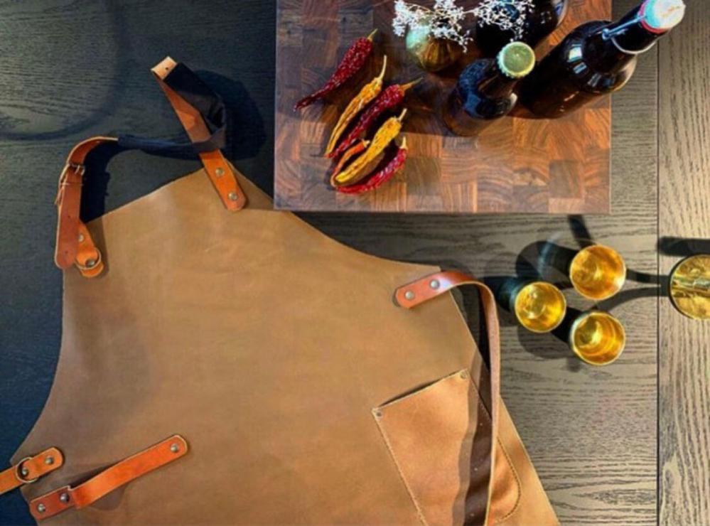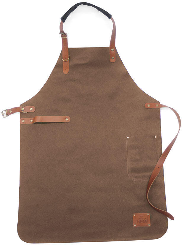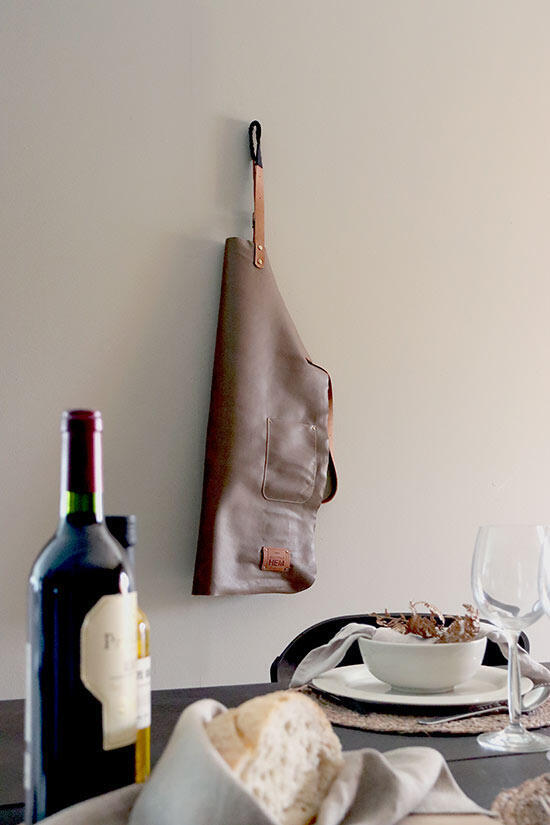 Exklusivt förkläde i mjukt läder, handgjort med praktisk ficka. Förklädet är tillverkat av koläder med justerbart midjeband av buffel-läder med mjukt tyg som nackband. Levereras i ett pappersrör, perfekt presentförpackning.