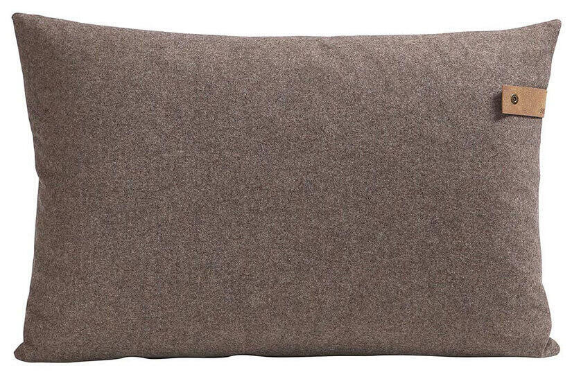 Shepherd Tina. En kudde i mjuk vävd ull med dekorativt handtag i läderimitation. Kuddfodralet är avtagbart och tvättbart med dold dragkedja. Innerkudde i polyesterblandning med fyllning av 50% siliconskruvar och 50% andfjädrar vilket gör att kudden känns fluffig och håller sin form.