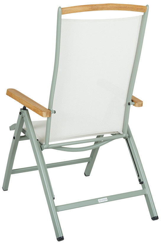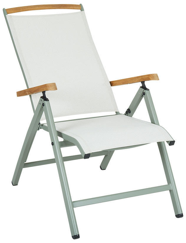 Stolen har reglerbar rygg och kan fällas ihop för smidig och praktisk förvaring. Den här modellen har stomme i dusty green aluminium, sits och rygg i offwhite vädertålig textilene, rostfria skruvar och beslag, armstöd och övre delen av ryggen i teak.