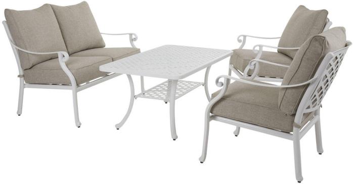 Den här loungegruppen består av 1st 2-sitssoffa, 2st fåtöljer och ett soffbord. Trädgårdsgruppen finns pulverlackad i matt antracitgrå och vit, ingår gör tjocka och rejäla dynor. Sitt- och ryggplymåerna ger skön sittkomfort och låter dig njuta härliga sommardagar. Tyget är av slitstark och tålig olefin, vilket även är väldigt motståndskraftigt mot solens strålar. Övriga Arras delar hittar du en bit ner på sidan under Liknande produkter.