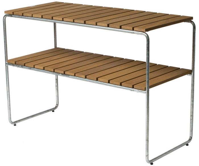 Avlastningsbord L105 är ett stilrent sidobord från Grythyttan Stålmöbler som passar in i de flesta utemiljöer. Ingår i Klassikerserien så du kan enkelt kombinera med andra möbler ur serien. De två planen gör bordet extra användbart. L105 är designad av Maria Håård och Jan-Olof Ågren och finns i tre utföranden; oljad ek, obehandlad teak och vitlackad ek. Alla med varmförzinkat stålunderrede.